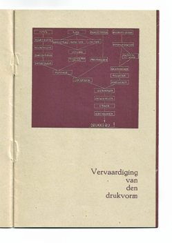 Daarna wordt de afdruk nog met een zwart poeder ingestoven; dit hecht alleen op den pasgedrukten, vetten letterafdruk, zoodat deze daardoor nog meer ondoorzichtig wordt. Die drukker is een secuur man! Ge ziet hem den afdruk tegen het licht houden; hij kijkt met een vergrootglas of die afdruk op cellofaan, die ,,pelure’’ genoemd wordt, wel goed scherp is. Is hij tevreden, dan verhuist de pelure onmiddellijk naar de Montage-afdeeling.