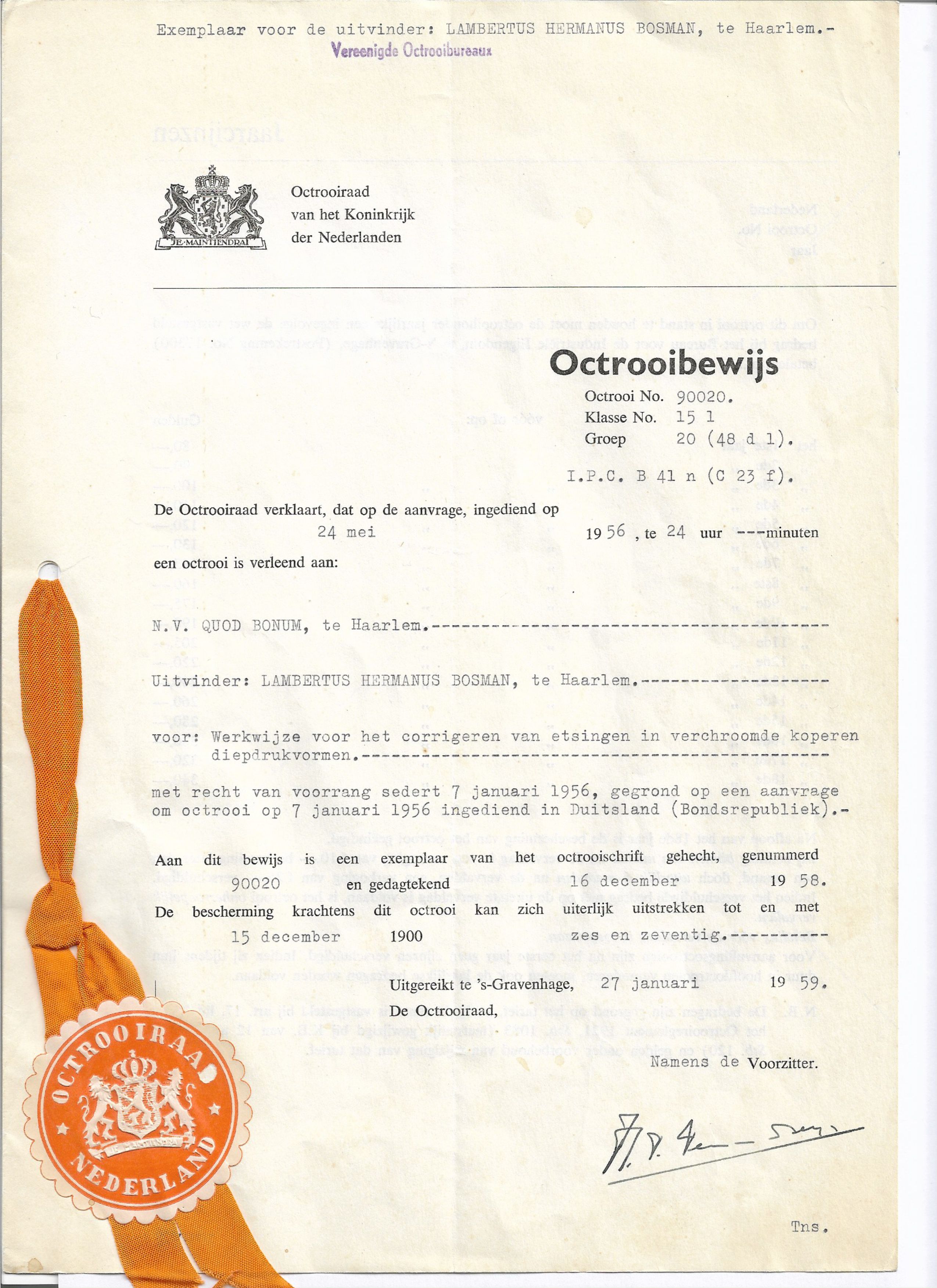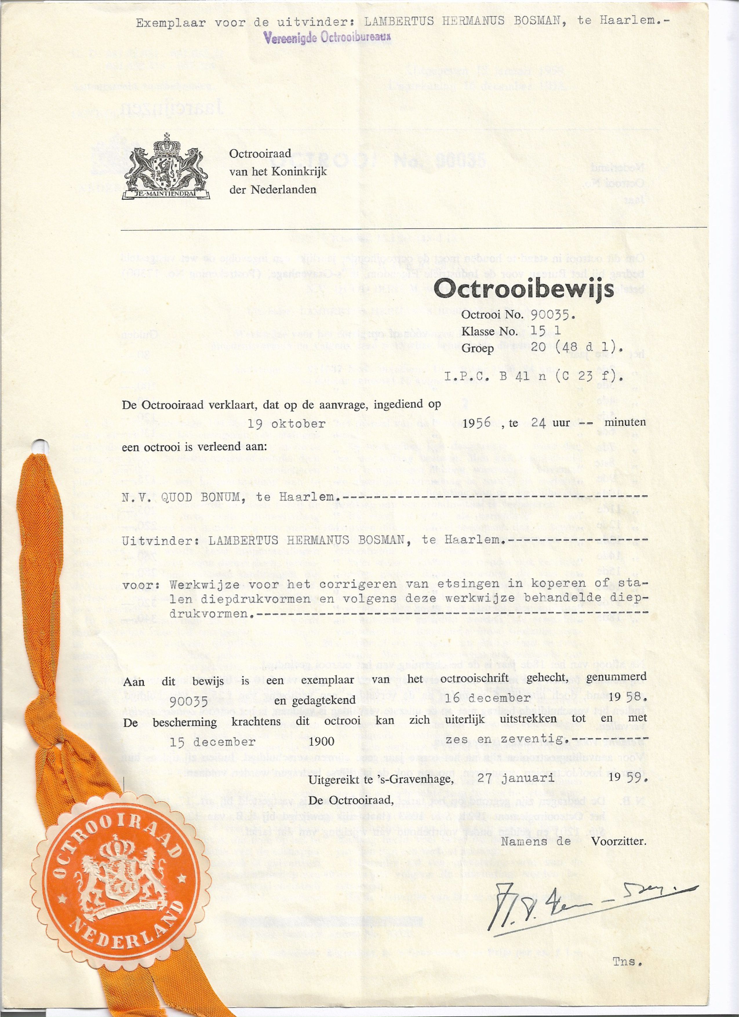 Oorkondes drukkerij en patenten van het ELBO-systeem. Vergoedingen van uitvinding
