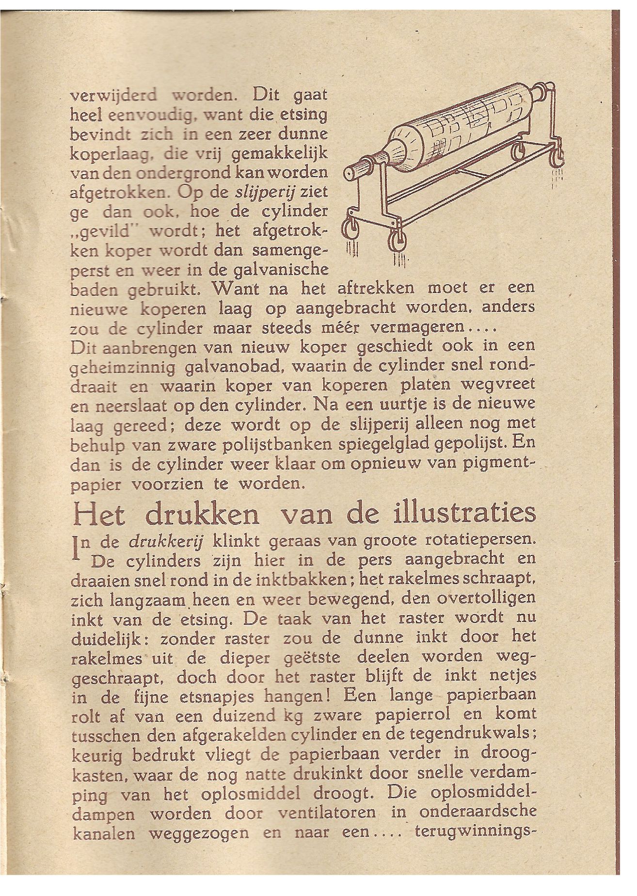 Ook wij gaan nu de deur uit! We passeeren nog de Rotatieboekdrukkerij (hoogdruk), met haar verschillende hulpafdeelingen; de Vellendiepdrukkerij, de Vellenboek- drukkerij en het Papierrollenmagazijn: een enorme op- slagplaats waar de rollen papier hun tijd afwachten om ,,aan den haak geslagen’’ te worden, en aan een rail hangend tot voor de persen gerold te worden. In de verte vangen we hog een glimp op van de Inktfabriek, doch het is voor dezen keer genoeg geweest. Ik denk dat ge, als ge weer eens een illustratie leest, niet alleen de afbeeldingen zult bekijken, doch ook zult terugdenken aan het ingewikkelde doch mooie diepdruk- procédé !