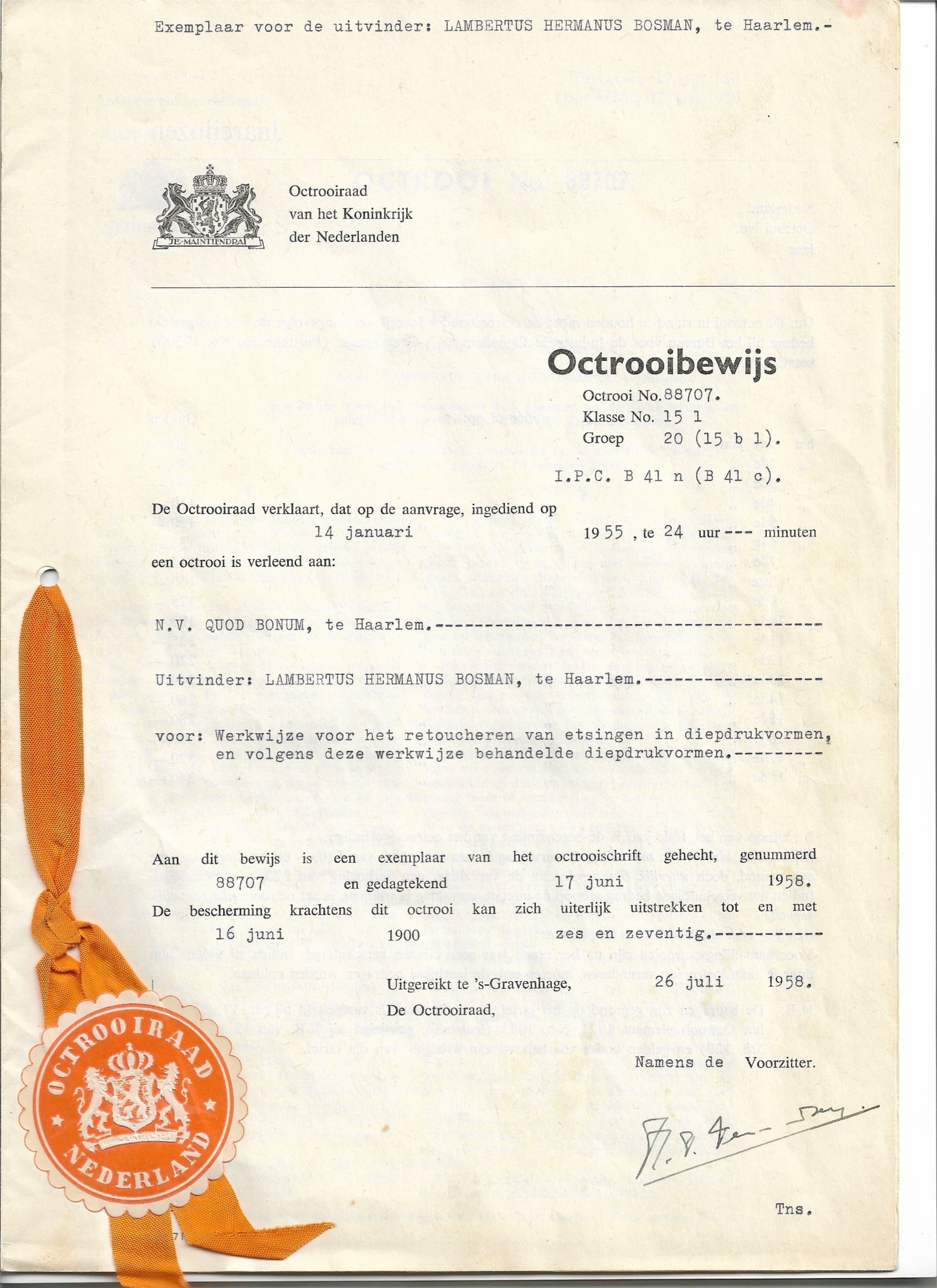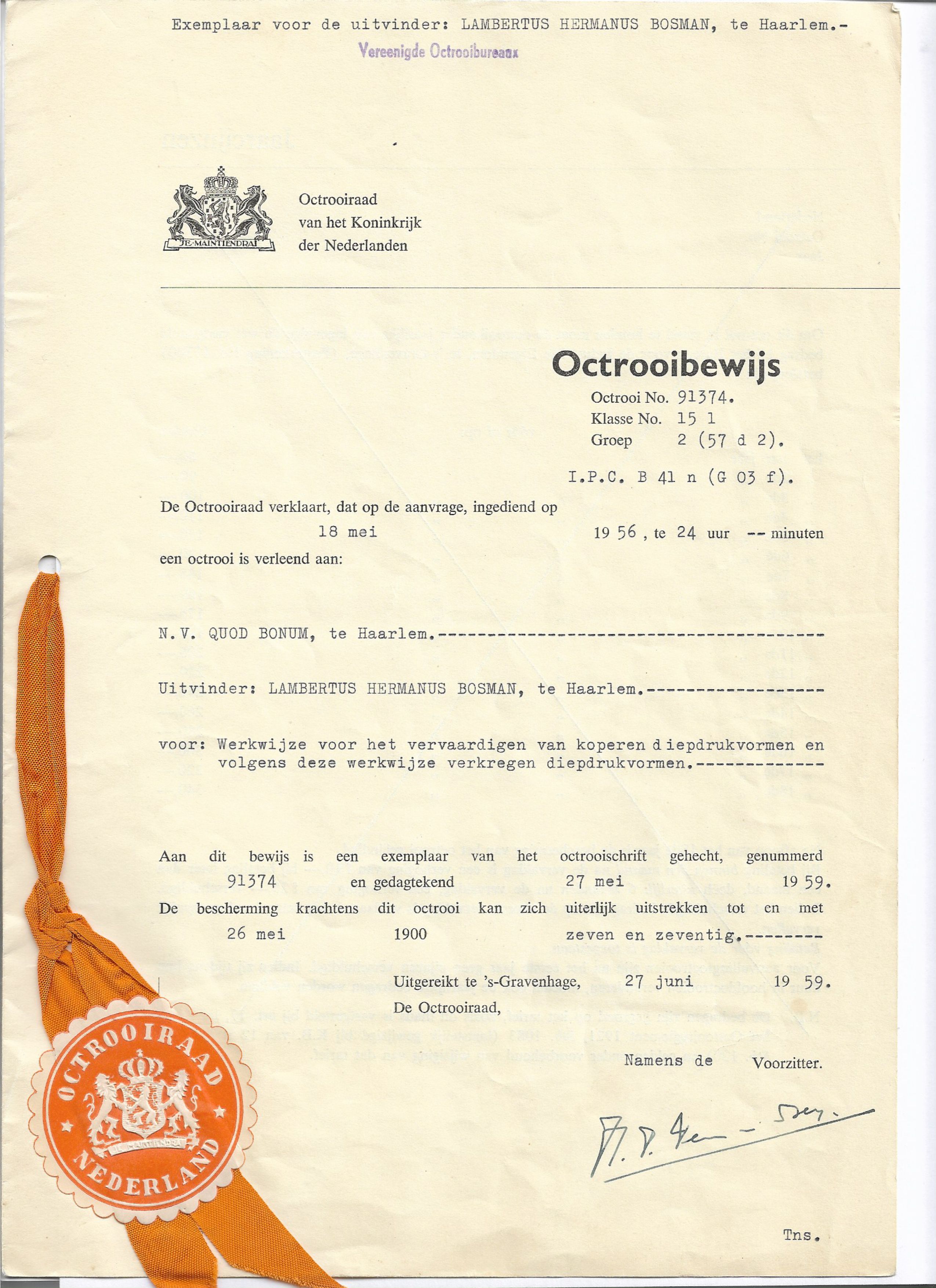 Oorkondes drukkerij en patenten van het ELBO-systeem. Vergoedingen van uitvinding